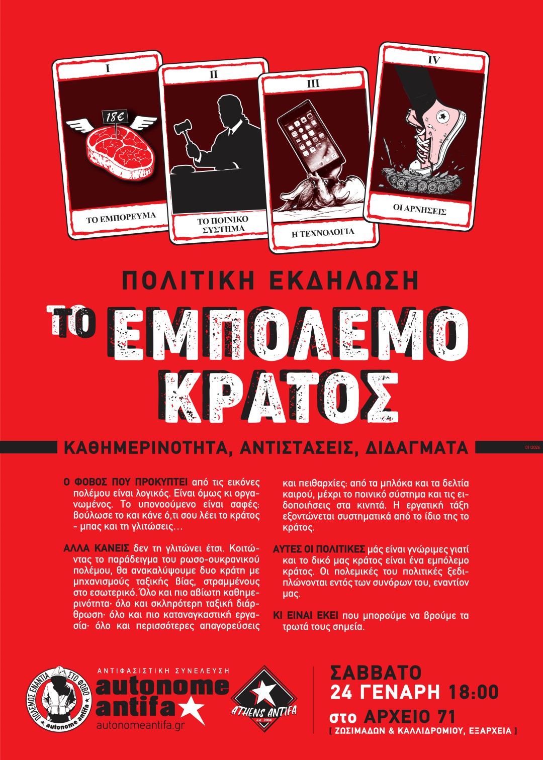 -Άντε, αφού το ανοίγεις το θέμα… Σε έναν κόσμο που το μόνο βέβαιο είναι η αβεβαιότητά του, χρειάζεται να πατάμε στις δικές μας σιγουριές. Δεν έχουμε πολλές τέτοιες, σύμφωνοι, αλλά είναι σημαντικό να μην παρασυρόμαστε. «Ούτε μια ώρα στο στρατό», αυτό είναι μια δική μας σιγουριά, χτισμένη από ατσάλι. «Ούτε μια ώρα στο στρατό», καλό δεν είναι; Γιατί κοίτα να δεις τις παγίδες του να μην πατάς σε δικό σου έδαφος: στον πόλεμο Ρωσίας-Ουκρανίας από το 2022 και μετά έχουν σφαγιαστεί περίπου ένα εκατομμύριο στρατιώτες και από τις δύο μεριές. Ένα εκατομμύριο! Κι όμως, αντί αυτοί οι δολοφονημένοι να γίνονται το κέντρο της οπτικής μας, έχουμε γεμίσει με «αναλυτές» (συνήθως «αναλυτές» – άτομα, έχει κι αυτό τη σημασία του) που εξηγούν ότι «έχασε ο Πούτιν» ή ότι «έχασε η Δύση». Δηλαδή ακόμη και στο εσωτερικό του κινήματος η ορολογία του κράτους μεταφέρεται αυτούσια. Όχι! Ούτε ο «Πούτιν» έχασε, ούτε η «Δύση» έχασε. Αυτό το ένα εκατομμύριο δολοφονημένοι είναι που έχασε, συν τους ακρωτηριασμένους, συν τους ψυχοσυναισθηματικά διαλυμένους, συν, συν, συν. Αυτοί οι δολοφονημένοι κι αυτοί οι ακρωτηριασμένοι, το πώς κατέληξαν εκεί που κατέληξαν μας πονάει. Κι είναι από κει που μας βγαίνει το «ούτε μια ώρα στο στρατό». Αυτό μας αντιστοιχεί να κάνουμε και να λέμε εδώ που μας έλαχε να ζούμε.